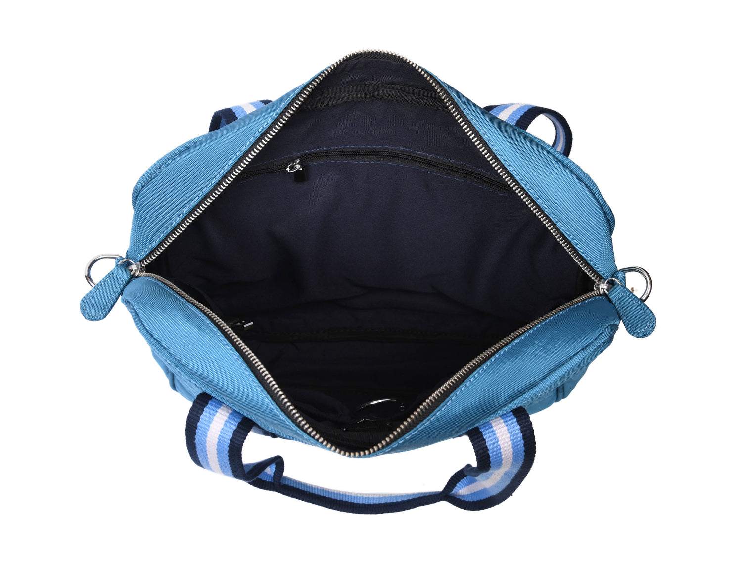 Stylish Design: Sleek black exterior with blue and white striped handles.